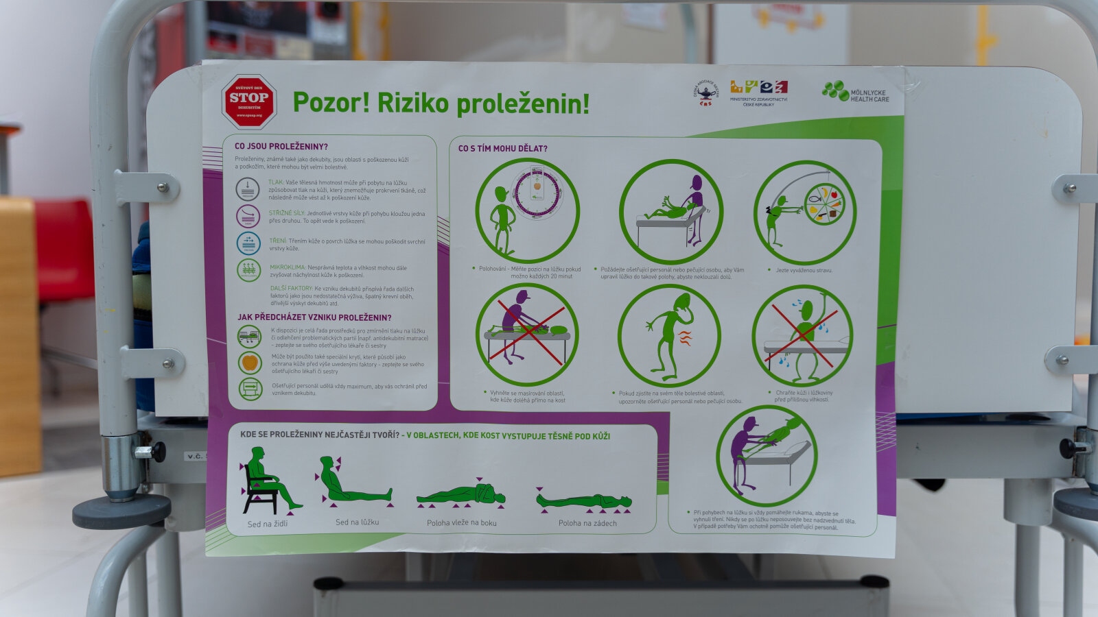 Problematika proleženin je závažné téma, kterému je třeba věnovat dostatečnou pozornost. Právě proto se MOÚ již po 9. připojuje ke světovému dni Stop dekubitům, který upozorňuje na tuto problematiku a apeluje na důležitost preventivní péče. V letošním roce tento den připadá na 18. listopadu. V MOÚ Vám erudované sestry na dvou stanovištích představí správné způsoby polohování i možnosti pomůcek, antidekubitních matrací a kosmetických přípravků. Nutriční terapeutky doporučí jídla s vyšším obsahem bílkovin a nabídnou poradenství a ochutnávku sippingů.